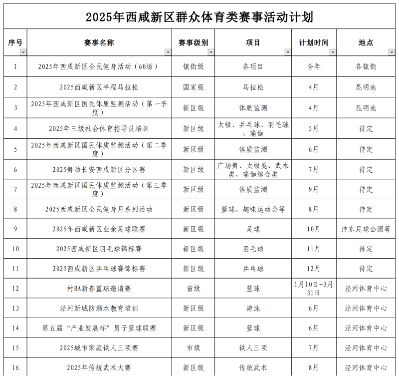 2025年西咸新体育赛事活动计划如下: