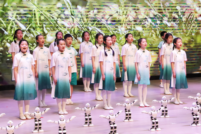 西咸一小、西咸一校“繁星”合唱团和机器人带来的创新表演《欢迎春姑娘》,人形机器人与同学们曼妙的歌声配合、队形多变、步调一致,让大家感受到科技带来的魅力。