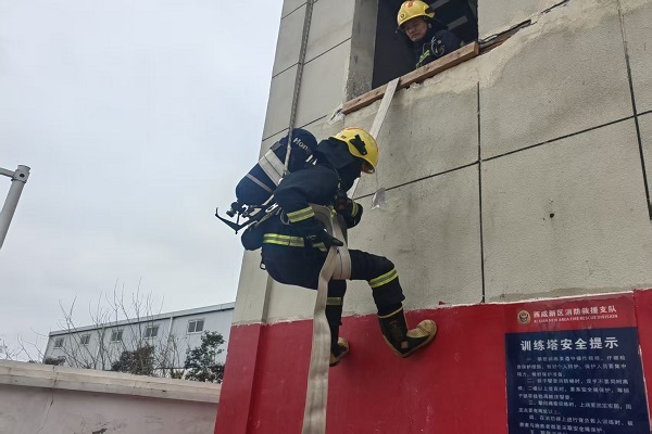 为进一步提升消防救援人员灭火救援实战能力和紧急避险水平,强化火场安全防护意识,近日,西咸新区消防救援支队建章路消防救援站组织开展沿水带撤离操训练。