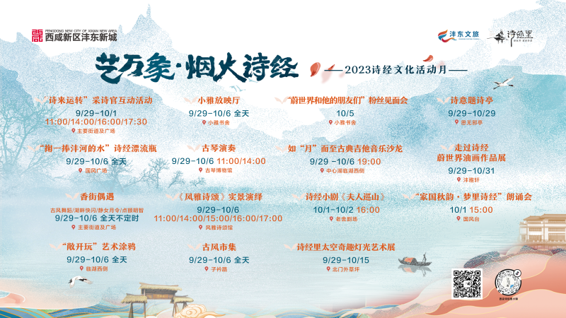 本届诗经文化活动月将持续至10月底,活动期间将举办“诗来运转”采诗官互动活动、小雅放映厅、诗意题诗亭等15项活动,以互动化、场景化的主题活动再现国风诗经文化盛宴。