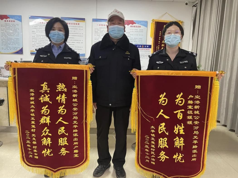 “谢谢你们上门来帮我们村的老人办身份证,天冷路滑,老人身体也不好,你们真是帮了大忙了!这不,老人家说啥都让我帮忙来送这面锦旗。”12月12日,太平镇王里堡村副书记卢先生拿着两面锦旗来到了公安西咸新区分局元平路派出所户籍室,感谢民警为王里堡村一名行动不便的老人上门办理身份证,解决老人的难题。