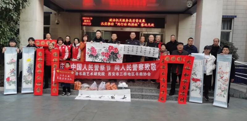 三桥新街派出所邀请盛唐书画艺术研究院书法家们在警察节当天走进警营,“送春联、润警心”。
