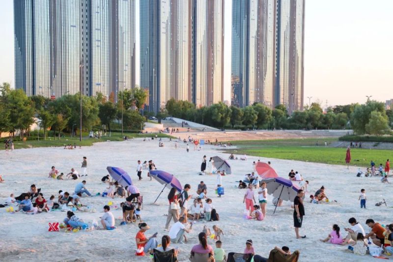 在不远处的沣河金湾白沙滩,小朋友们在沙滩、草坪上嬉戏,大人们则约上三五好友相聚于此,搭起天幕,吹着河风,对饮小酌,给忙碌的生活按下了暂停键,快乐在此刻无限蔓延。“孩子很喜欢挖沙子,这里离家很近,趁着晚上不热了就过来玩一会。”附近居民张女士说。