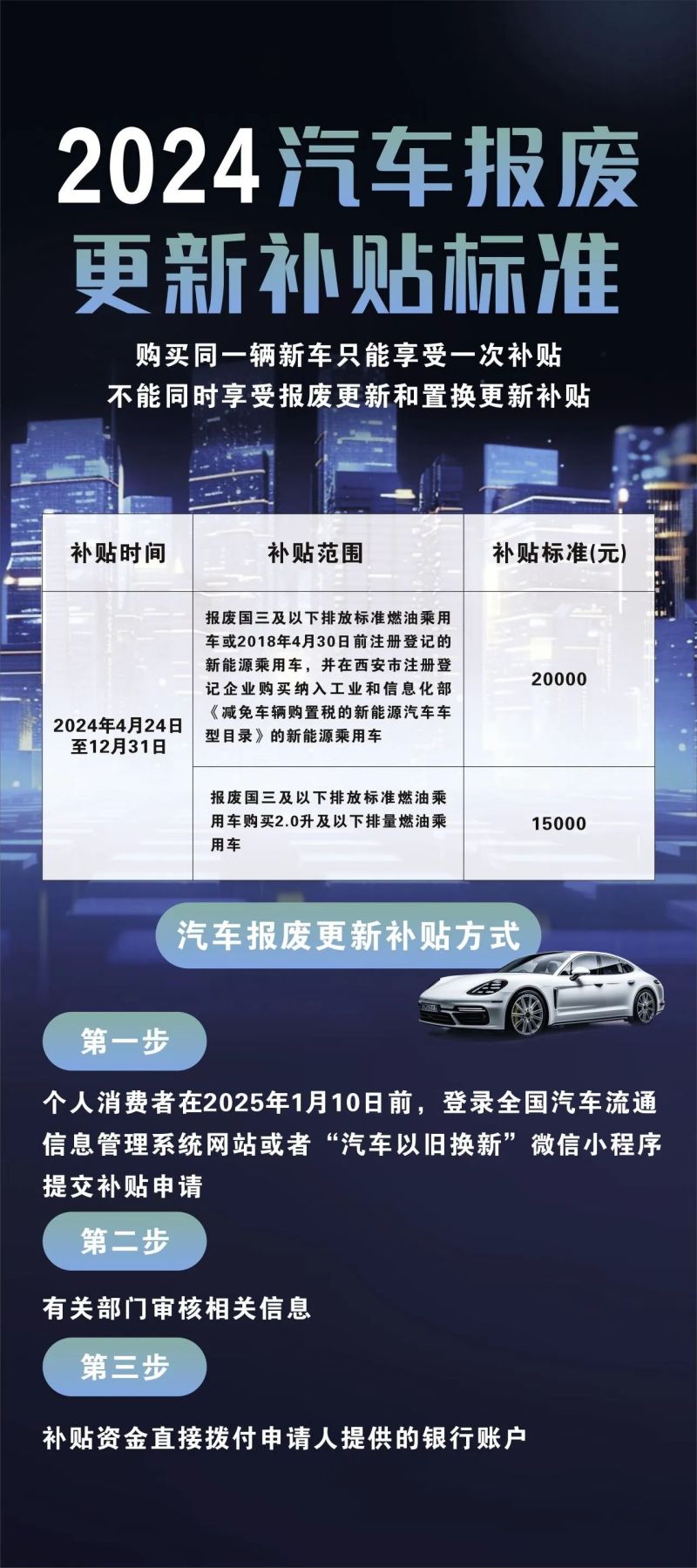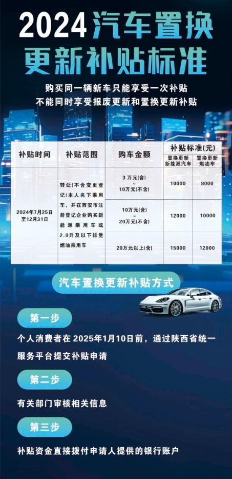 在享受国家汽车以旧换新、西安市购车置换补贴的基础上,活动现场购车可再额外享受最高2000元购车补贴,补贴申请时间需为展销活动持续时间内,以活动现场登记为准。名额有限,先到先得。
