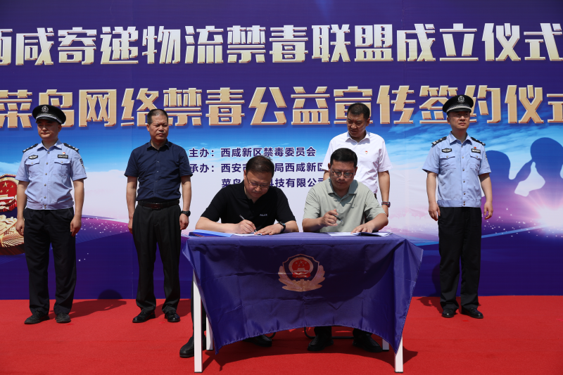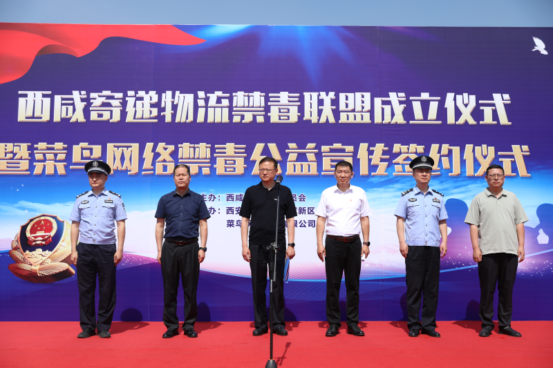 公安西咸新区分局立足实际、结合现状,6月14日上午,在菜鸟西北物流基地举行西咸新区寄递物流禁毒联盟成立仪式。西安市禁毒委员会办公室副主任,西安市公安局禁毒支队副支队长张四维、西安市邮政管理局市场监督管理处处长李永哲、西安市公安局物流寄递犯罪侦查支队七大队大队长张仕禹、西咸新区禁毒委员会办公室主任,公安西咸新区分局副局长李勇生、公安西咸新区分局刑侦大队副大队长王辉及菜鸟集团公共事务部西北区域总经理刘伟参加了仪式。