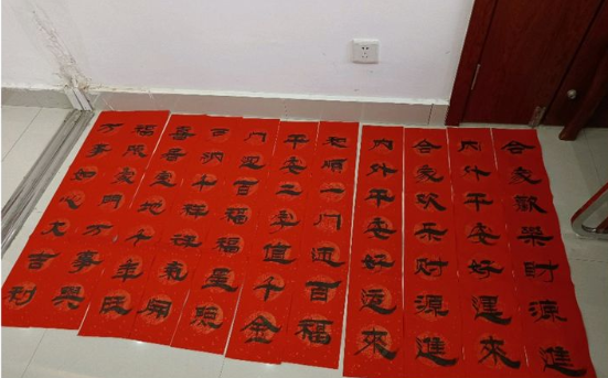 在空港花园社区党群服务中心会议室,书法爱好者书写新春的祝福。提笔蘸墨,挥毫泼墨,把祝福一笔一画融入到书法作品中,红红的春联,浓浓的墨香,提前为春节增添了喜庆气氛,让大家在墨香中感受渐行渐近的浓浓年味。春联虽小,情谊浓浓,老师从上午九点到十一点持续为居民书写对联100多幅,“福”字150张。