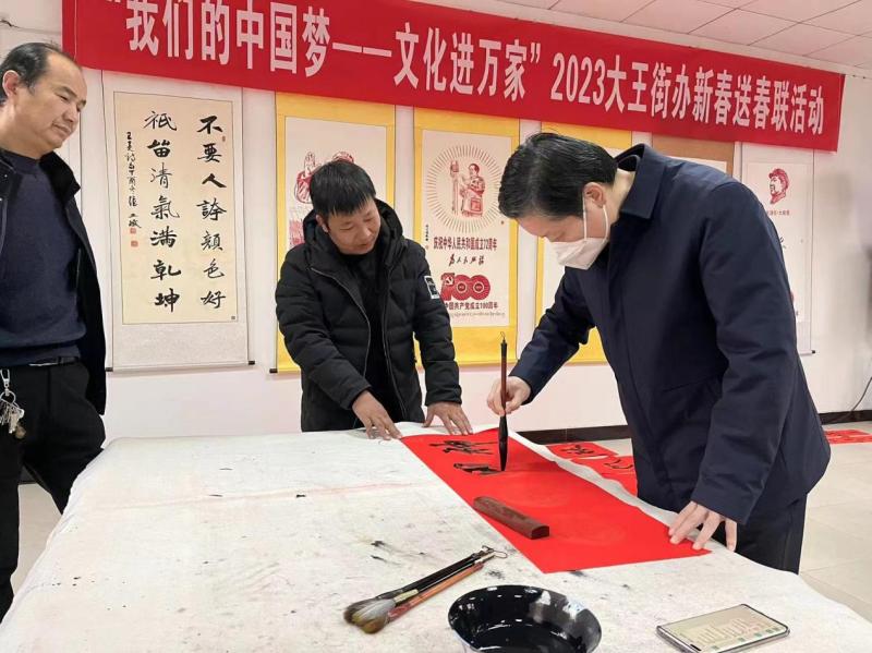 “鞭炮声声迎新年,妙联横生贴门前。”新年贴福字、贴春联是中华民族一直延续的文化传统,春联象征吉祥、寓意平安,表达人们对美好生活的向往。节日期间,大王街道特别邀请辖区书法老师们为广大群众现场写春联,送祝福。一副副充满喜庆、吉祥、祝福的春联在大师的手中随笔而出,行、隶、楷等多种书体各显神韵,赢得大家的频频点赞。红纸黑字,一横一竖,一撇一捺,写的是吉祥与团圆,是对新年的美好祝福。笔墨之间,流露出的浓浓年味,更是中华传统文化的代代相传。