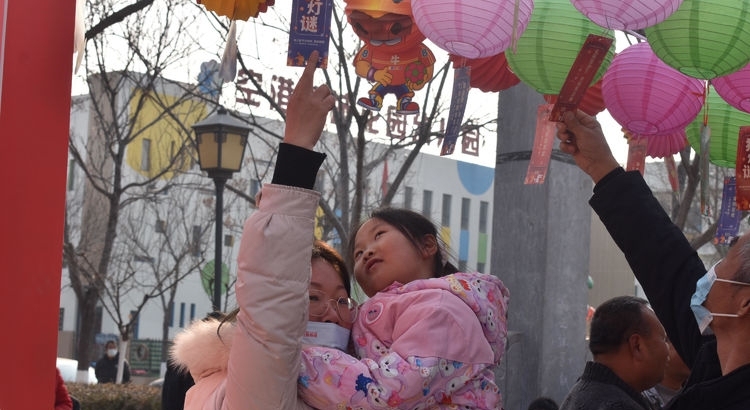 “花落溪前间,如武陵胜景。(猜名胜)”,“金乌西坠白头看。(打一地名)”......一盏盏红色花灯营造了温馨、祥和、欢乐的节日氛围。
