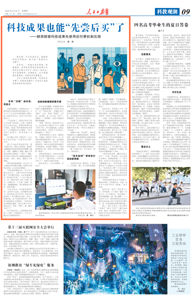 今天,人民日报海外版刊发《科技成果也能“先尝后买”了——陕西探索科技成果先使用后付费机制见闻》,聚焦西咸新区在全省率先开展科技成果先使用后付费试点工作,打通产学研壁垒,为培育壮大新质生产力注入强劲动能。
