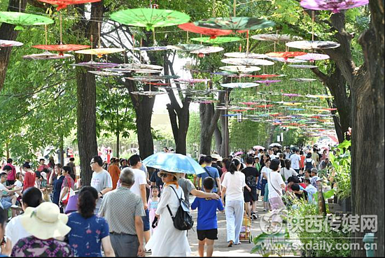 7月14日,在沣东荷苑,游人戏水赏荷。当日,位于西咸新区沣东新城斗门街道办普贤寺村的荷苑,上百亩荷塘里600多种荷花竞相绽放。翠绿的荷叶丛中,亭亭玉立的荷花像披着薄纱在湖中沐浴的仙女一样,或含笑伫立,或娇羞欲语,摇曳着曼妙的身姿,徜徉在水云间,构成一幅夏日竹风摇塘满苑荷香的美景,吸引数万名游人市民流连忘返。据了解,最近正值荷花盛开旺季,沣东荷苑周一至周五每日游客过万,双休日达到三、四万人。记者 袁景智摄