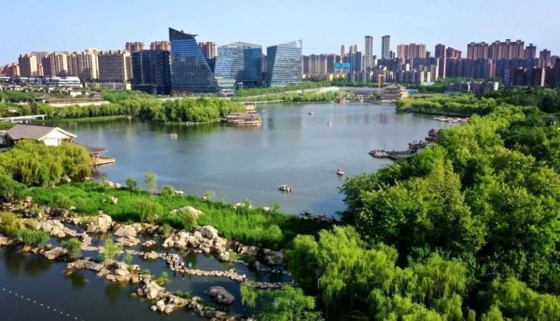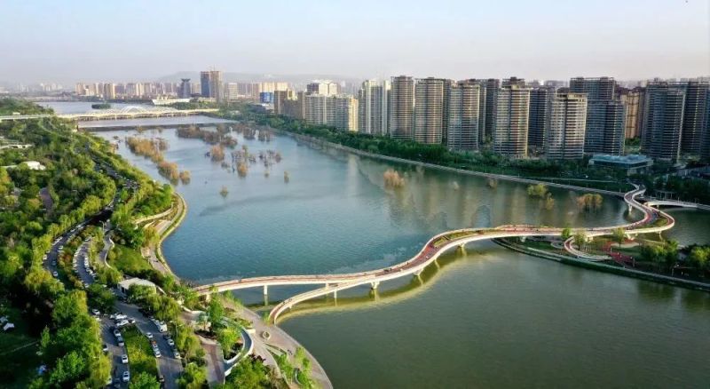 位于西安浐灞生态区的灞河两岸景色(4月16日摄,无人机照片)。新华社记者 刘潇 摄