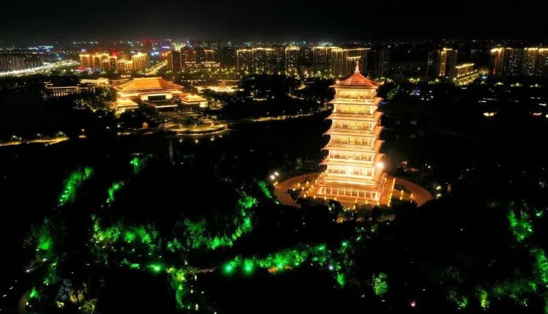 西安曲江南湖夜景(4月19日摄,无人机照片)。新华社记者 刘潇 摄