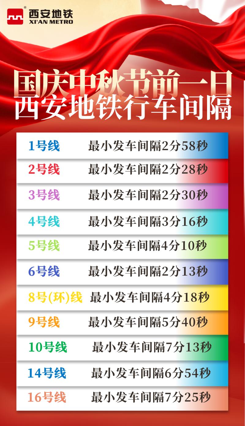 国庆中秋双节期间(9月30日-10月8日),2号线草滩站、常宁宫站末班车发车时间均调整至23:55(西安北站往城区方向的末班车发车时间为次日00:00);3号线鱼化寨站、保税区站末班车发车时间分别调整至23:33、23:08;4号线西安北站、航天新城站末班车发车时间均调整至23:30;14号线机场西(T1、T2、T3)站、贺韶站末班车发车时间分别调整至22:50、23:00;其余线路末班车发车时间保持不变。