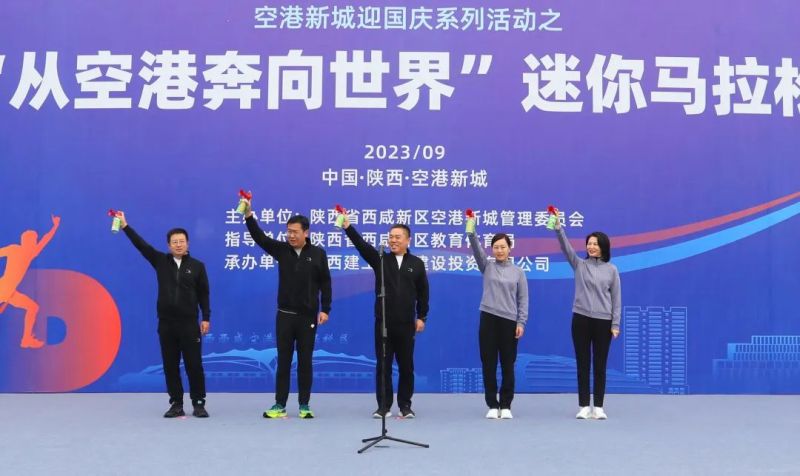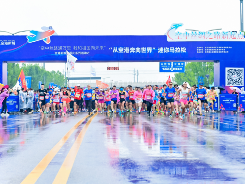 5-4-3-2-1,随着发令汽笛响起,空港新城西安临空会展中心前近千名参赛者掠过龙门,从空港奔向世界,与祖国共赴未来。