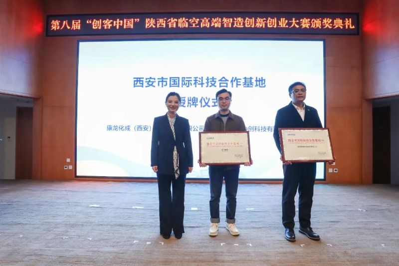 会上,秦创原创新促进中心为西安锐境协创科技有限公司颁授“临空增材制造共享实验室”牌匾。西安市科学技术局、西安市外国专家局为康龙化成(西安)科技发展有限公司、西安锐境协创科技有限公司颁授“国家国际科技合作基地”牌匾。
