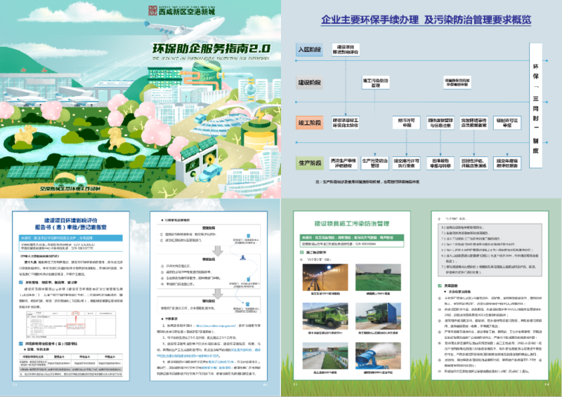 针对环保手续流程“无头绪”,编制《空港新城环保助企服务指南》,帮助企业梳理出入区、建设、竣工及运营各个阶段需要办理的手续及申报流程,并以图文并茂形式展示,方便企业查阅使用。