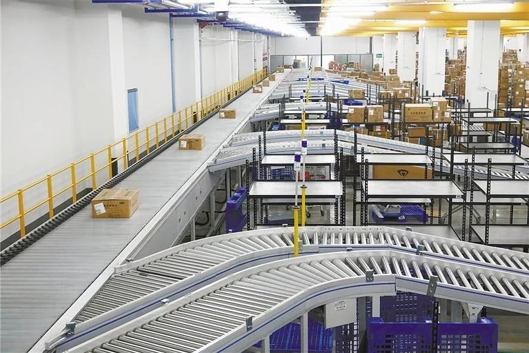陕西数字医药产业园仓库内滑块分拣机正在拣货