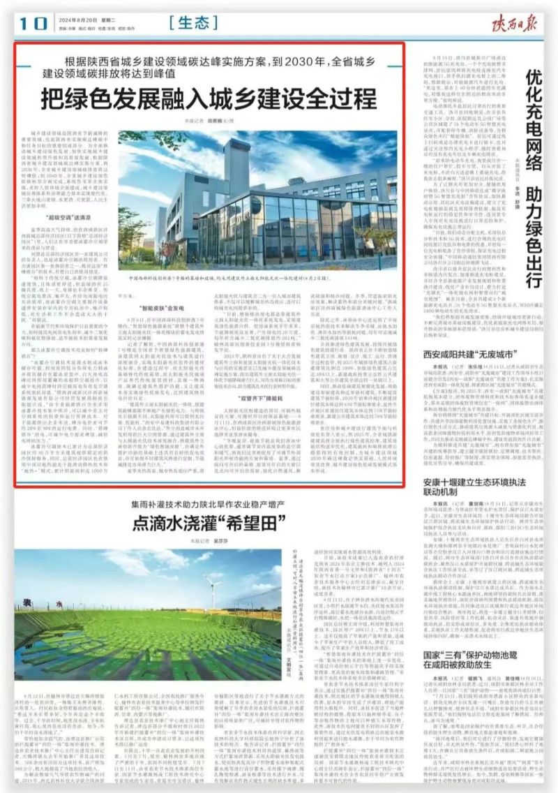 8月20日,陕西日报刊发报道《把绿色发展融入城乡建设全过程》,关注西咸新区沣西新城不断加大新能源的开发和利用,大力推广绿色低碳技术,全面推进绿色建筑发展,为实现“双碳”目标贡献力量。