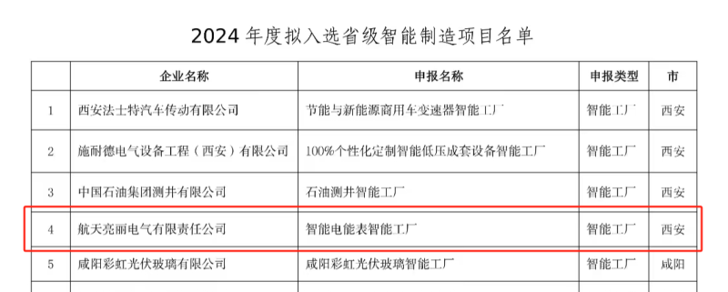 近日,陕西省工业和信息化厅公示“2024年度省级智能制造项目”名单。沣东新城辖区企业航天亮丽电气有限责任公司(下称“航天亮丽”)“智能电能表智能工厂”,绿能慧充数字技术有限公司(下称“绿能慧充”)“新能源汽车充电桩智能生产车间”,成功入选!