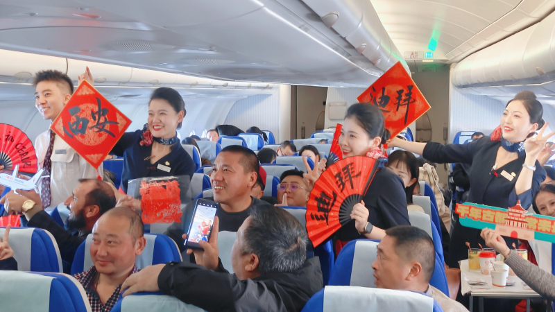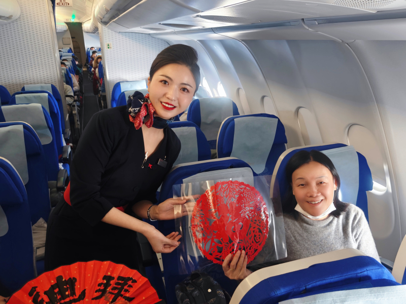 飞行途中,乘务组还贴心地为旅客准备了西咸新区非遗传承人亲手制作的剪纸、挥毫书写的毛笔折扇等独具特色的礼品。当这些满溢中华优秀传统文化韵味的礼物送到旅客手中,他们轻轻摩挲剪纸的纹理,欣赏着精巧的折扇,指尖仿佛划过岁月长河,真切领略到中华优秀传统文化的深厚底蕴。