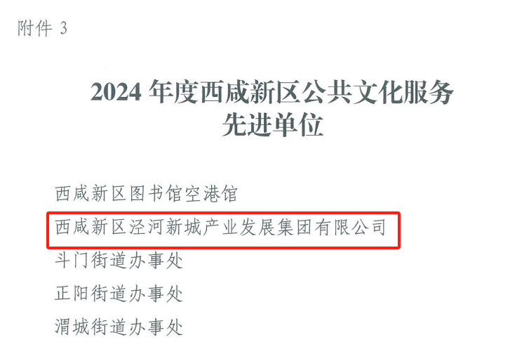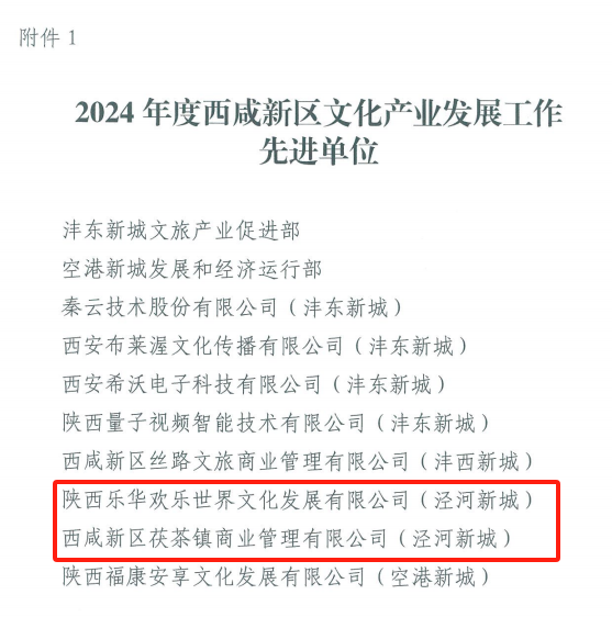 近日,陕西乐华欢乐世界文化发展有限公司和西咸新区茯茶镇商业管理有限公司同时获评2024年度西咸新区文化产业发展工作先进单位;西咸新区泾河新城产业发展集团有限公司获评2024年度西咸新区公共文化服务先进单位。