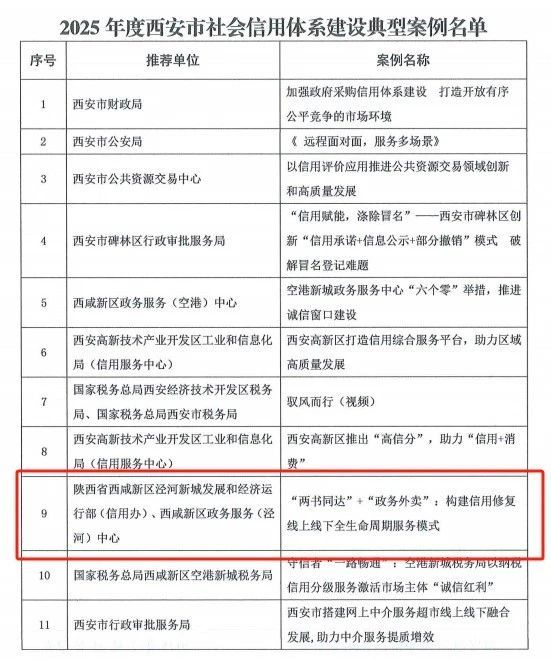 近日,西安市工业和信息化局发布2025年度西安市社会信用体系建设典型案例名单,由泾河新城发展和经济运行部、西咸新区政务服务(泾河)中心推荐的“‘两书同达’+‘政务外卖’:构建信用修复线上线下全生命周期服务模式”案例成功入选,成为新城优化营商环境的创新实践典范。