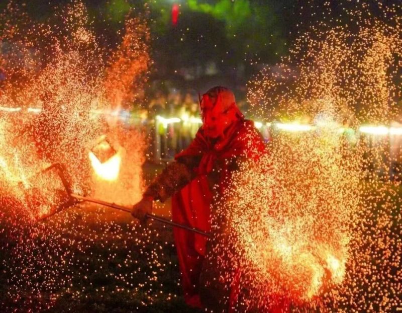 炫彩夺目的“铁花映月”表演吸引往来游客驻足观看,匠人们以千度铁水为笔,在夜空中勾勒出璀璨的火花,如同给月亮镶嵌了一层光环,让“繁光远缀天”的诗意跃然眼前,引得游客纷纷仰头惊叹,小朋友们更是兴奋地拉着父母的手,直呼“比烟花还美”!