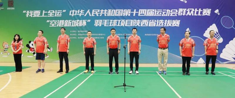 开幕式上,陕西省体育局副局长董利,空港新城党委书记、管委会主任贺键,省羽毛球协会会长韩中林,省参加十四运会群众赛事活动工作小组副组长苏晓刚,省羽毛球协会筹备十四运会群众比赛羽毛球项目工作领导小组组长赵廷周,空港新城党委委员、管委会副主任刘功毅、胡新建,空港集团党委书记、董事长蒙彬斌,省乒乓球羽毛球网球运动管理中心副主任李爱莉等来宾与参赛选手及赛事工作人员同声唱响国歌,共同祝愿祖国繁荣昌盛。
