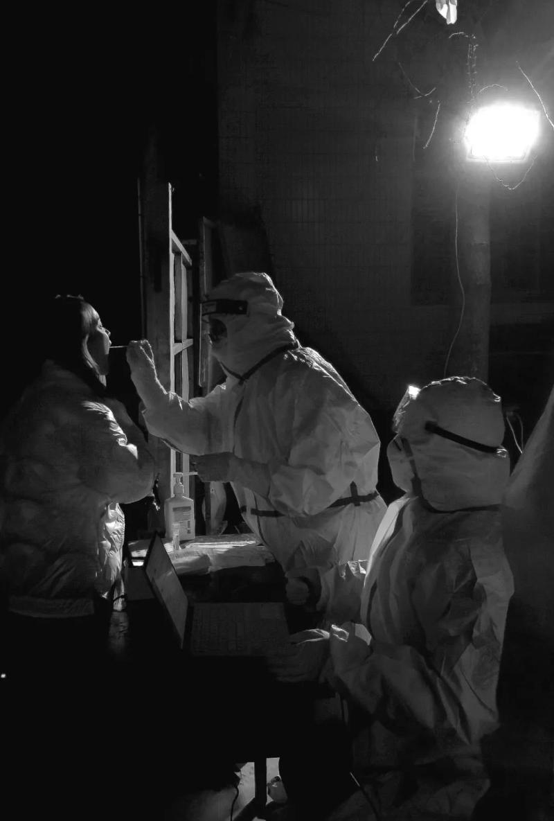 深夜微弱的灯光下,斗门街道荆寺二村核酸采样点上,工作人员仍在忙着采样工作。