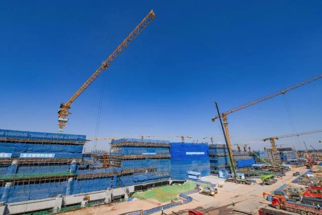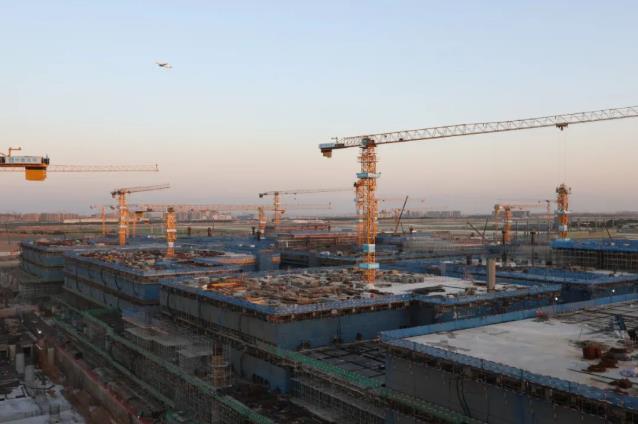 东航站楼主体采用现浇钢筋混凝土框架结构,由主体向外伸展的六条指廊、层叠立体的GTC综合交通枢纽以及贯穿于其间联通各处的交通线路组成,总建筑面积70.03万平方米。为全力加快西北民航发展史上最大的单体建设项目工程进度,西部机场集团机场建设指挥部争分夺秒、昼夜施工,共计投入渣土车、商混车、货运车37万余台次,施工区域塔吊41组,高峰期单日参建人员达万余人。截至目前,航站楼土方开挖253.278万方,主体混凝土30.55万方,主体钢筋64743.12吨,现已累计完成投资25.06亿元。