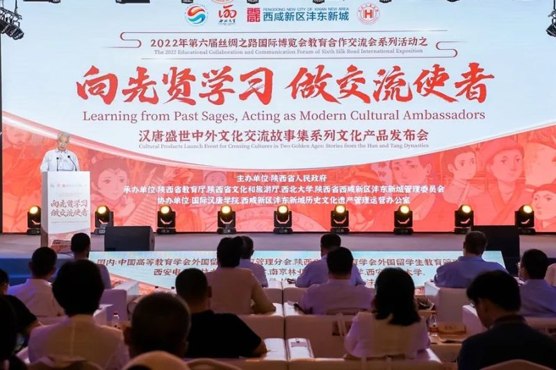 传播汉唐文化,深化人文合作。7月16日,2022年第六届丝绸之路国际博览会教育合作交流会之汉唐盛世中外文化交流故事集系列文化产品发布会与丝路主题绘画作品展活动在沣东新城自贸新天地成功举办。