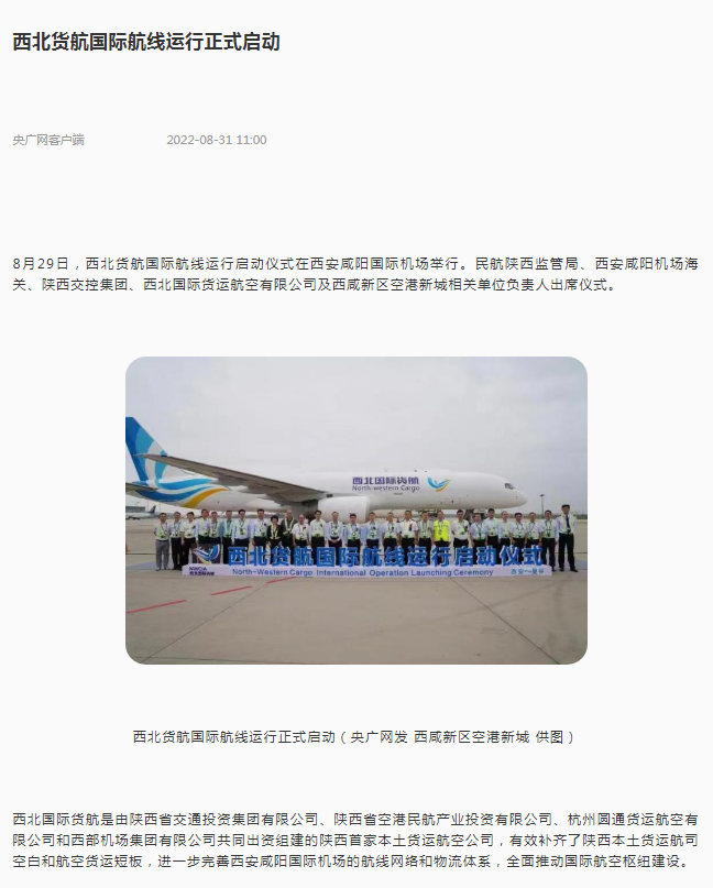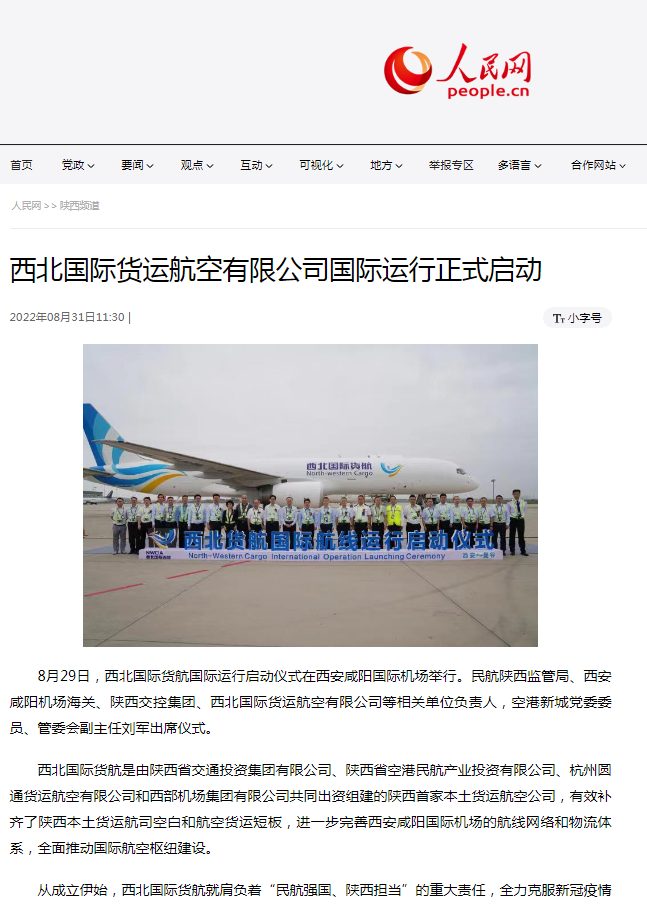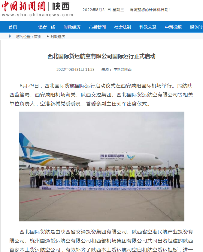 近日,人民网、新华网、中新网、央广网、国际在线、中国报道网、陕西日报、陕西广播电视台、西安广播电视台等中央、省级、市级媒体,纷纷聚焦空港,全方位报道陕西首家本土货运航空公司西北国际货运航空有限公司国际航线成功首飞,开启陕西全球货运新篇章。