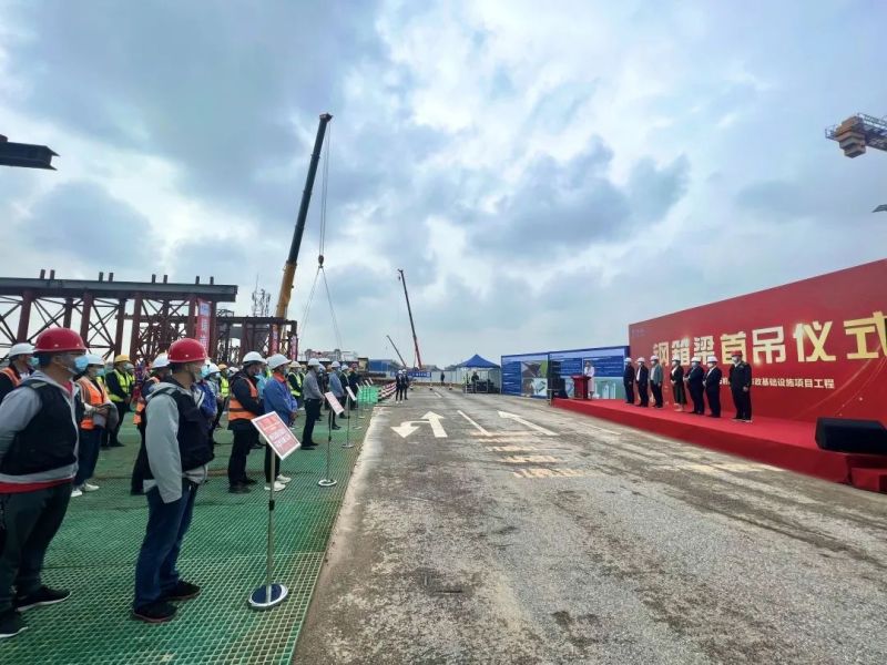 本项目钢结构桥梁总用钢量约1.7万吨,设计复杂且施工难度大,是桥梁工程建设过程中的控制性节点。此次钢箱梁首吊,不仅是高架桥梁工程建设的里程碑,更是T5站前商务区综合交通系统形成的最为关键的工序之一。