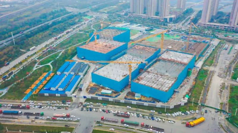 项目主体目前采用流水分段施工,四栋生产厂房中,一栋已封顶,一栋已施工至顶层,其余两栋正在进行地下室筏板钢筋铺设,综合办公楼施工至地上一层,预计2024年初建成投用。