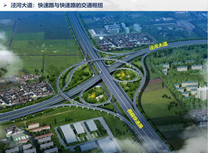 从连通内部的快速路、立体交通、断头路、跨界路,到畅通与西安主城区和周边高速快速路、轨道交通的衔接,到与高陵、空港、秦汉、铜川等地的互联互通,泾河新城在融入轨道、高速、机场的区域网络交通建设中,正在构建起“12345”的综合立体交通格局,即一条铁路,两个货运站,三条高速公路,四纵四横的城市路网骨架,五条地铁规划线路。