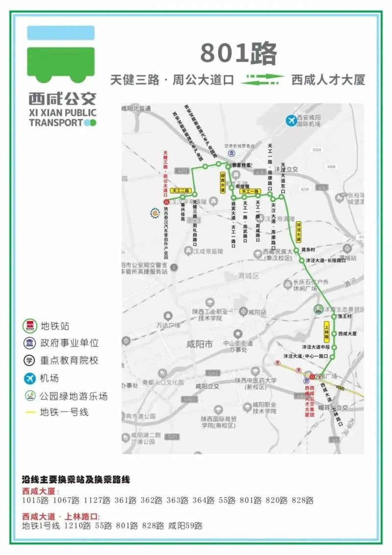 801路公交车始发站为西咸人才大厦,途经上林路地铁站、沣泾大道中心一路口、西咸大厦、鱼王村、长陵地铁站、天工一路、迎宾大道、天工二路等重要交通站点和路线。陕西秦汉汽车零部件产业园站的通车,不仅提高了园区配套服务质量,有效解决园区职工出行“最后一公里”问题,更为入园企业发展创造了便利条件。
