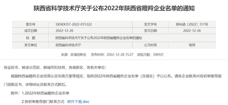 12月26日,陕西省科学技术厅公布了2022年陕西省瞪羚企业名单(含潜在),秦汉新城5家企业入选。其中,瞪羚企业4家,潜在瞪羚企业1家。