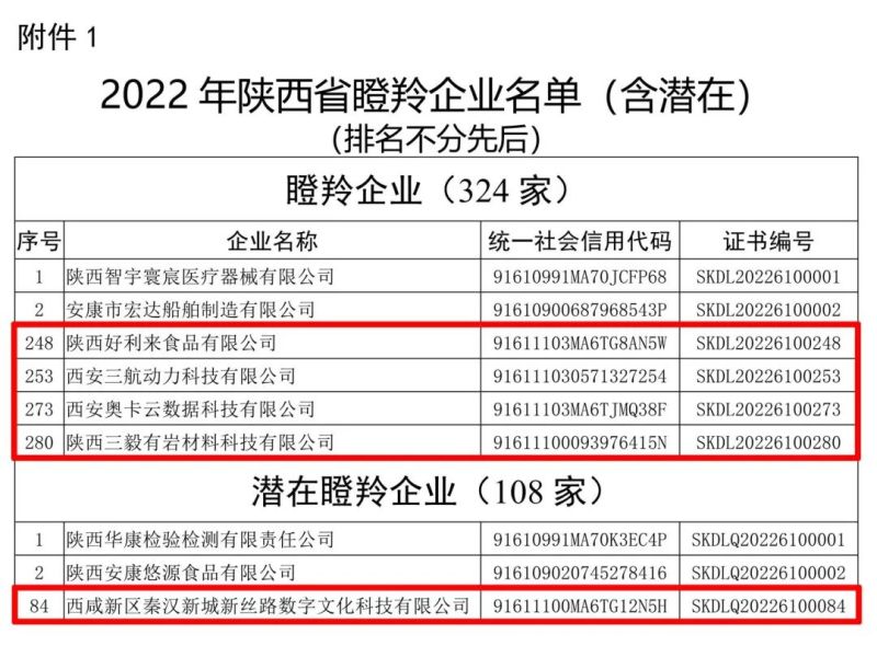 此次入选的5家企业分别是:西安奥卡云数据科技有限公司、西安三航动力科技有限公司、陕西三毅有岩材料科技有限公司、陕西好利来食品有限公司、西咸新区秦汉新城新丝路数字文化科技有限公司(潜在瞪羚企业)。