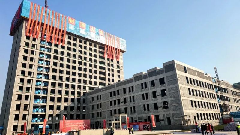 陕西省中医药研究院迁建项目(一期)位于沣东新城自贸服贸产业园,占地面积97亩。项目总投资9.31亿元,总建筑面积约10.97万平方米,建设内容涵盖科研楼、门诊楼、住院楼、综合实验楼等5栋建筑单体,设置床位500张。截至目前,项目已全面封顶,整体计划于2024年完成建设。