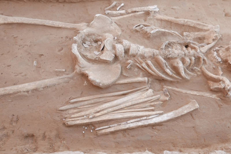 M2墓主盆腔内胎儿碎骨及随葬品出土情况