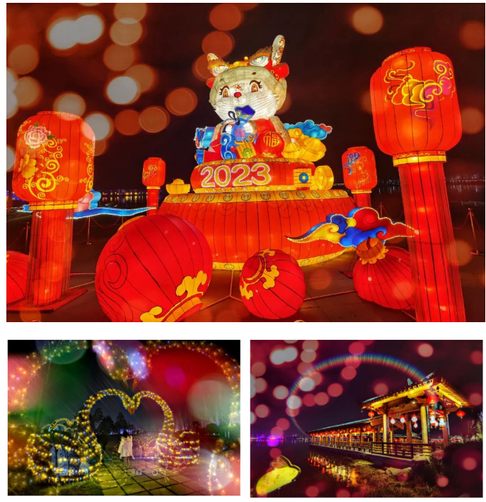 夜幕降临,在昆明池七夕公园,兔年新春主题等特色花灯点亮夜空,非遗民俗表演轮番登场点灯笼、放河灯等特色项目也吸引了众多游客参与互动。
