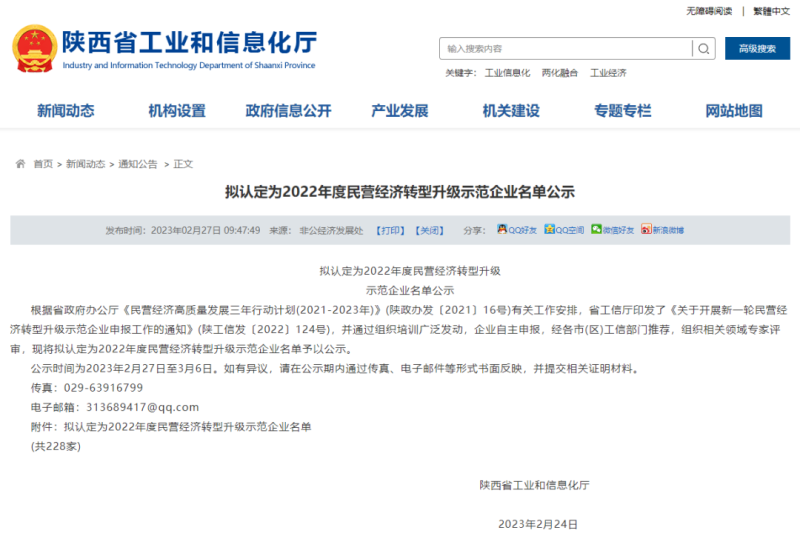日前,陕西省工业和信息化厅公布了《拟认定为2022年度民营经济转型升级示范企业名单》,沣东新城8家企业入选。