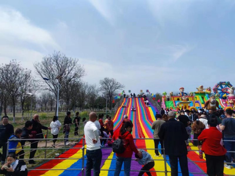 花香满径,芬芳满园,正是春季赏花好时节,放眼望去满眼的色彩斑斓。蓝天下,各种颜色的花相映成趣,绿油油的超大片草地平铺开来,吸引大批游客打卡拍照游玩。