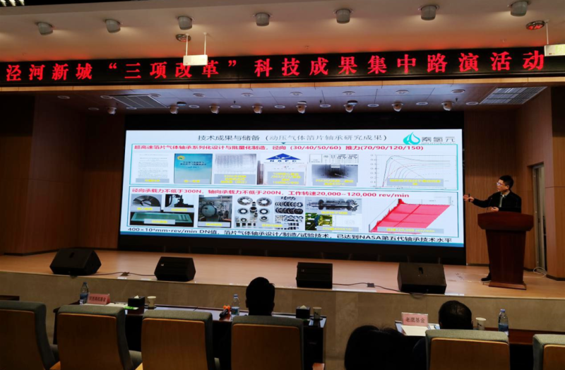 路演环节,来自秦氢元(陕西)能源科技有限公司的项目团队代表张昭首先登台,介绍最新研发成果——车载氢燃料电池用超高速空气压缩机项目。他说,“团队目前研发的超高速空压机综合应用了动压气体箔片轴承、高速永磁变频电机设计与控制、离心压缩机系统集成3大核心技术,具有技术储备深、体积小、功率密度高等优势,未来可以广泛地应用于氢燃料电池、技术服务、产业链发展等领域……”随着张昭的讲述,他所推介的超高速空气压缩机项目的优势、前景逐渐被大家所了解。