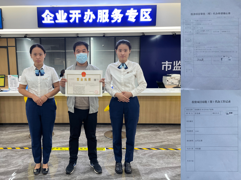 9月13日,创瑞激光3D打印生产基地项目通过小程序提交了一份公司注册事项帮代办的服务申请,后台审批人员收到消息推送后第一时间安排行政专员对接,一次性告知业务办理所需材料,并协同市监工作人员积极为项目提供帮代办服务,次日该项目就拿到了营业执照和印章。