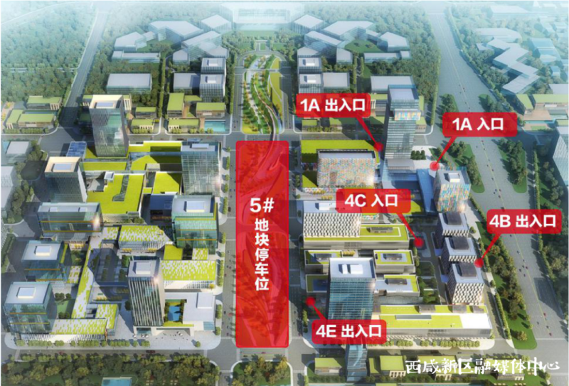 其中5号地块地下停车场位于能源金贸区中央绿廊,分为负1层及负2层,共920个车位,目前可通过1号、4号地块停车场出入口出入。诺富特酒店停车楼出入口位于西咸大厦向北150米处,共414个车位。