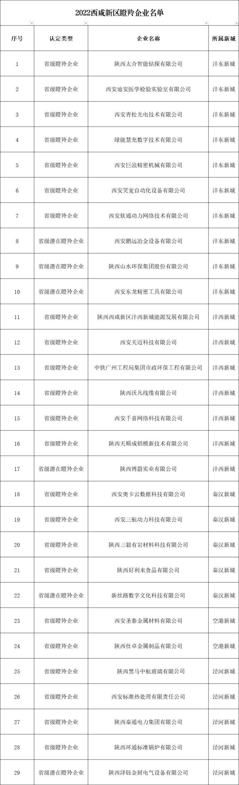 近日,省科技厅公布了“2022年陕西省瞪羚企业名单”陕西太合智能钻探有限公司、西安圣泰金属材料有限公司、陕西三毅有岩材料科技有限公司等西咸新区29家企业入选,为新区创新发展增添动能。