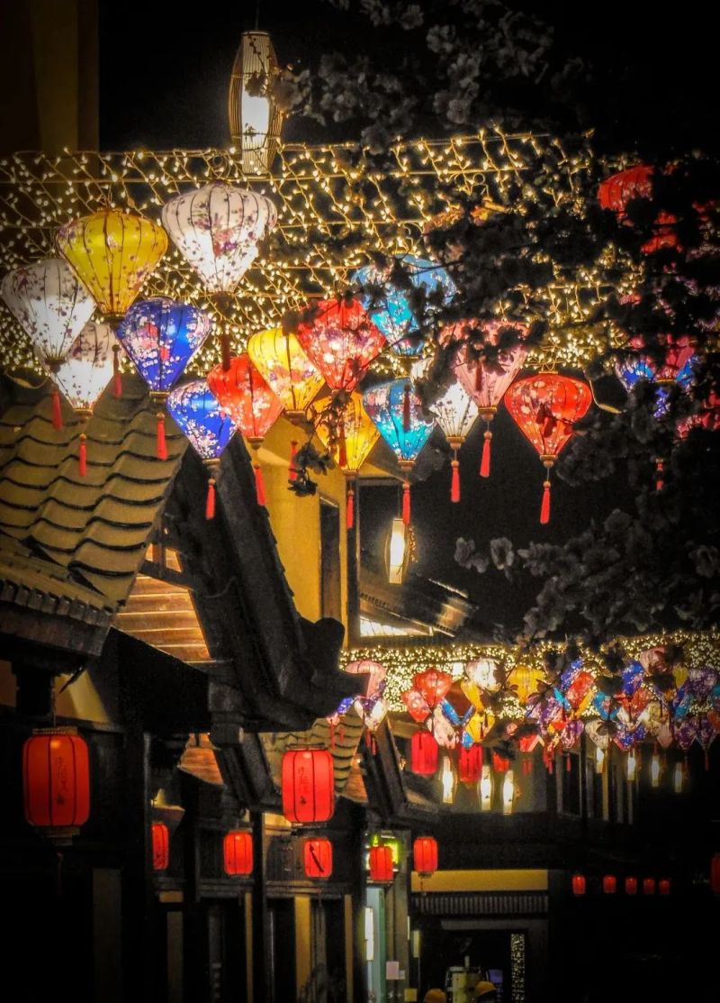 在鹿鸣食街和琇莹香街,巨龙花灯蜿蜒盘旋,锦鲤花灯灵动活泼,身着汉服穿梭其中,与花灯为伴既浪漫又好玩。