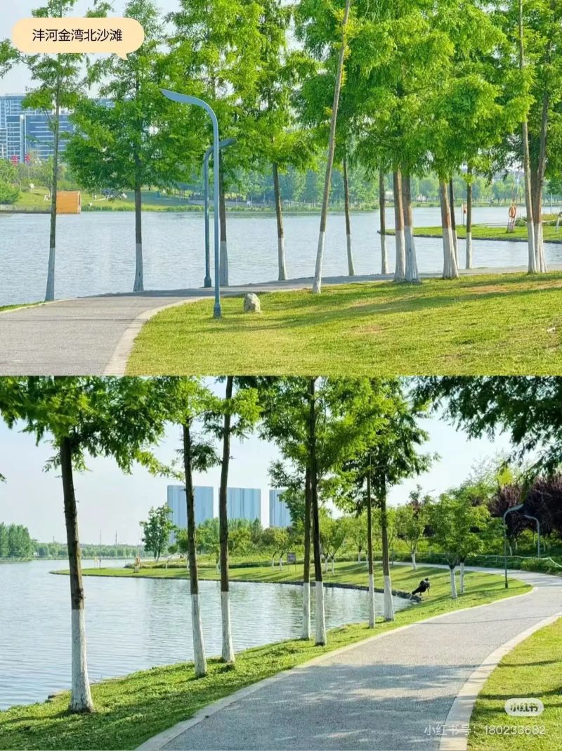 牵手沿岸边漫步,晚风伴着沣河流水声拂过,浪漫值直接满格。夕阳西下时,整个沙滩和湖面被染成暖金色,波光粼粼的模样像极了真正的海边,氛围颜值双双拉满。