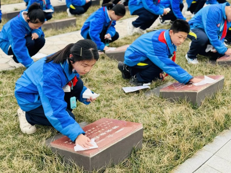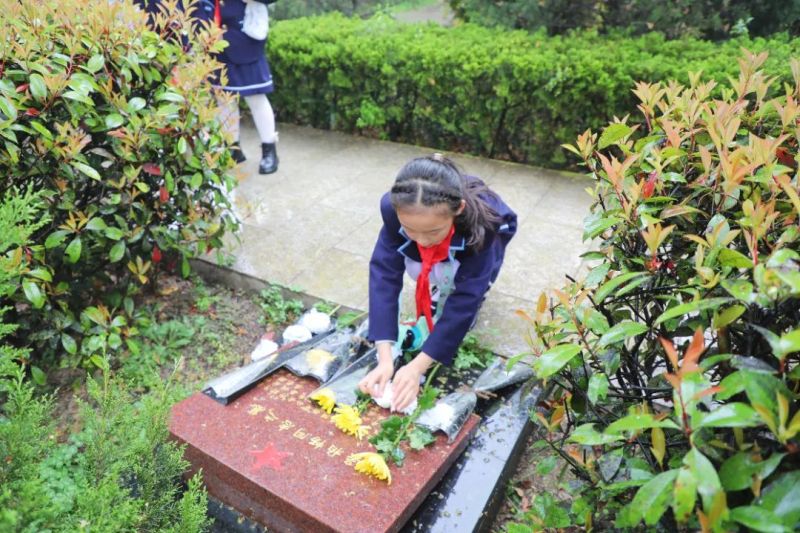 缅怀先烈,继承遗志。珍惜当下,努力奋斗。孩子们敬献花束,细心擦拭烈士墓碑,表示要把英烈的精神融入到学习、生活中,争做新时代好队员。